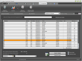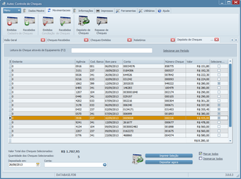 Controle os cheques recebidos de seus clientes, incluindo os repasses para terceiros. Faça a conciliação de cheques, informando cheques devolvidos como por exemplo cheques sem fundos. Controle os limites de cheques de um cliente ou de um emitente de cheques. Faça a movimentação de cheques (repasse ou depósito) usando leitor de cheques CMC7, de forma ágil, e sem erros. Exporte relatórios e consultas em vários formatos, inclusive PDF e Excel.